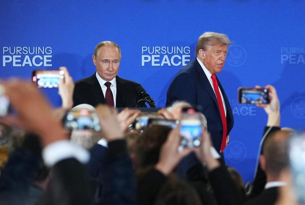 2025年8月15日,美國總統特朗普(後右)與俄羅斯總統普京(後左)在美國阿拉斯加州安克雷奇市埃爾門多夫-理查森聯合軍事基地舉行會晤後共同出席聯合記者會。新華社記者吳曉凌攝