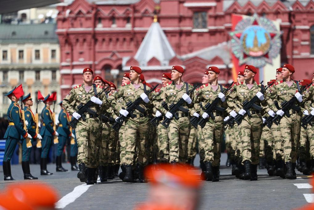 2025年5月9日,俄羅斯軍人在首都莫斯科參加紀念蘇聯偉大衛國戰爭勝利80周年閱兵式。新華社記者白雪騏攝