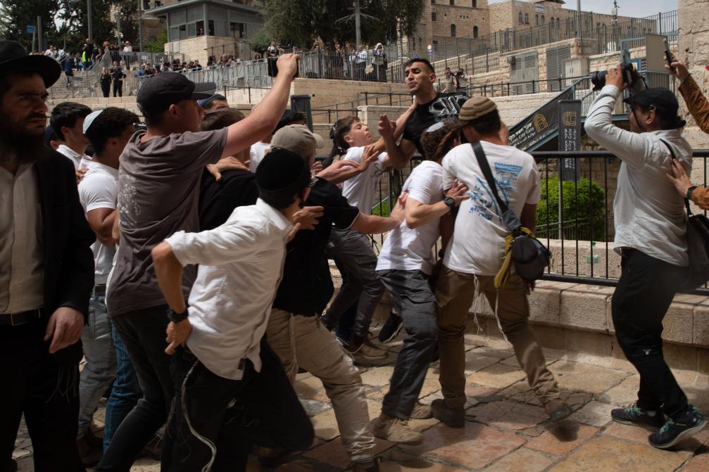 2025年5月26日,在耶路撒冷老城舉行的“耶路撒冷日”游行期間,參加游行的以色列極右翼人士與一名巴勒斯坦人(中上)發生衝突。