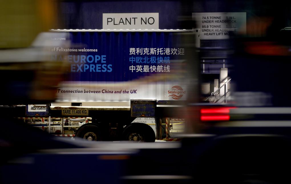 這是2025年10月13日在英國費利克斯托港拍攝的印有“費利克斯托港歡迎中歐北極快航”字樣的集裝箱。新華社記者李穎攝