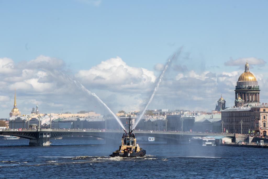 2025年5月3日,拖船在俄羅斯聖彼得堡涅瓦河上表演破冰船節的標誌性活動——“水上華爾茲”。新華社發(莫京娜攝)