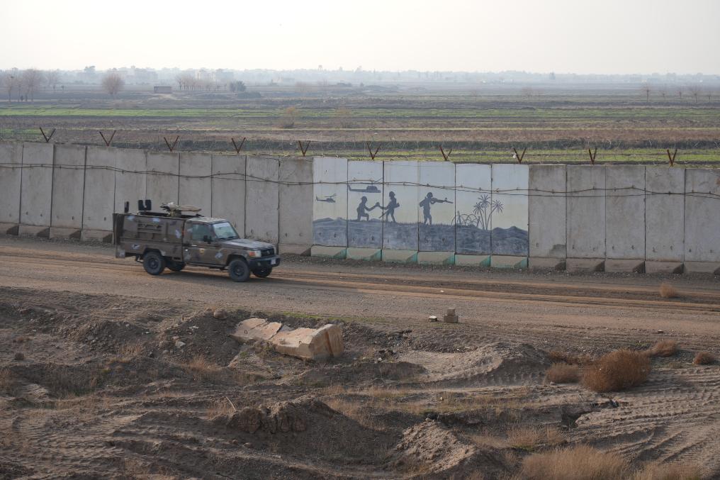 行駛近7個小時後,車輛抵達邊境城市加伊姆,在一處哨所前停下。我被允許登上附近的一處高地。放眼望去,涂刷成伊拉克國旗配色的哨塔間隔排列,一道水泥邊境墻連綿延伸,墻內側還有一道平行的鐵絲網,用於防止翻越的金屬倒刺在陽光下閃着寒光。全副武裝的伊軍士兵分佈於崗樓哨卡,軍車不時往來,捲起塵土。遠處,伊拉克和敘利亞兩國國旗在邊境線兩側比肩而立。