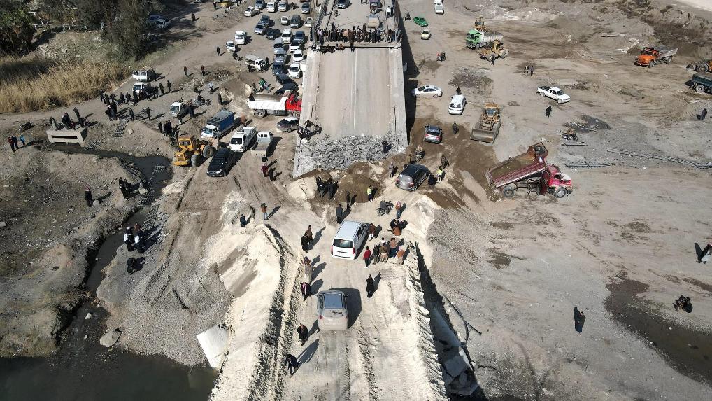 這是1月21日在敘利亞東部拉卡省航拍的在衝突中被炸毀的拉希德大橋。新華社發