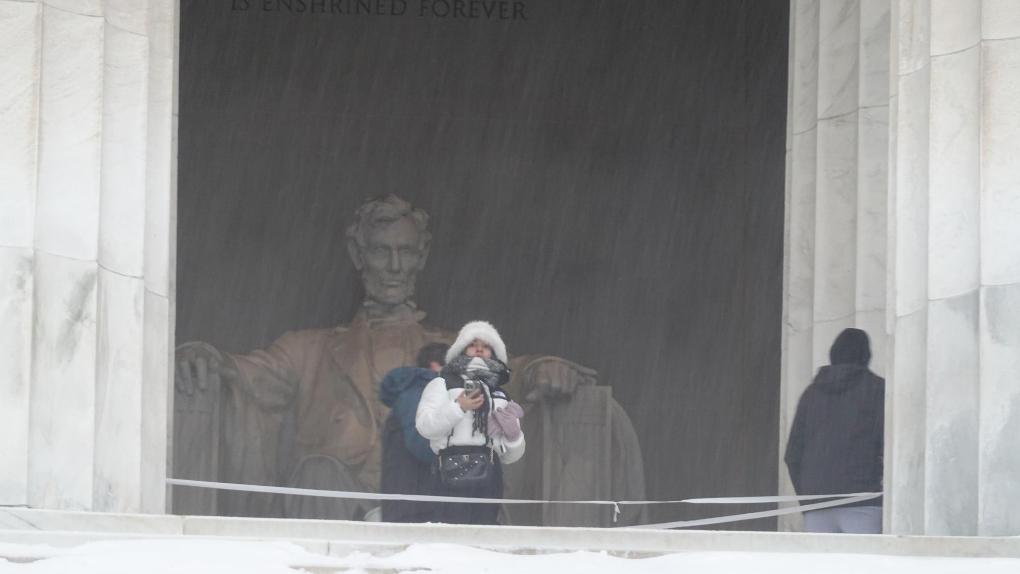 1月25日,人們冒雪參觀美國首都華盛頓的林肯紀念堂。新華社記者徐劍梅攝