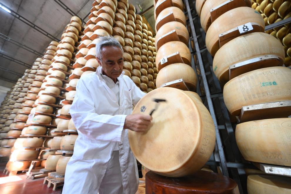 2025年7月17日,工作人員在意大利帕爾馬附近的一座奶酪工廠檢查帕馬森奶酪的品質。新華社發(阿爾貝托·林格裏亞攝)