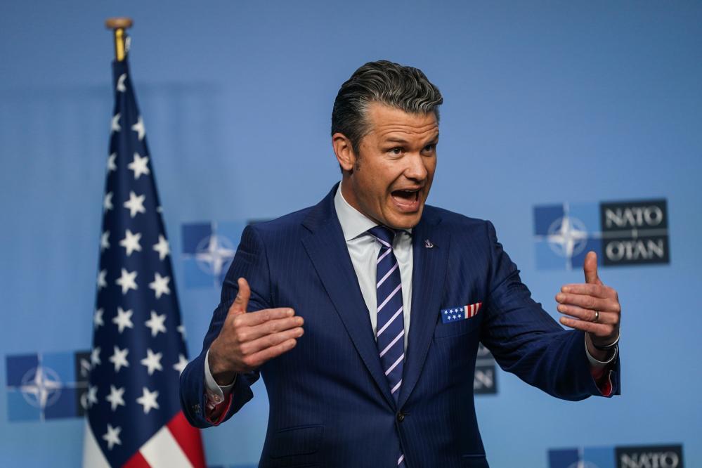 2025年10月15日,在比利時布魯塞爾,美國國防部長赫格塞思在與北約秘書長呂特共同舉行的記者會上發言。新華社記者 彭子洋 攝