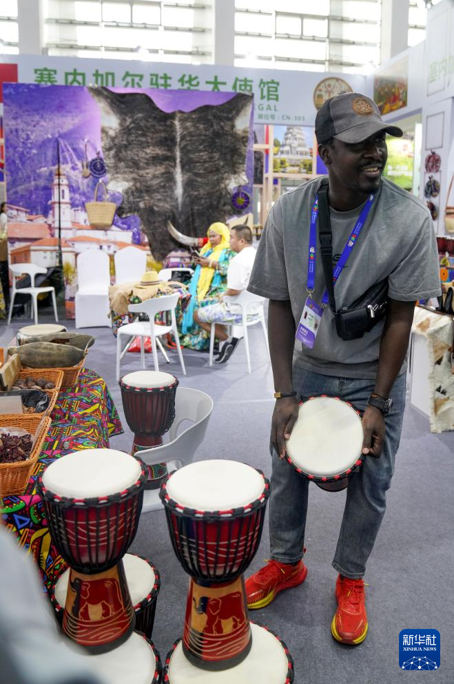 8月28日,塞內加爾展商在第七屆中國—阿拉伯國家博覽會為觀眾表演非洲鼓。新華社記者 趙宇思 攝