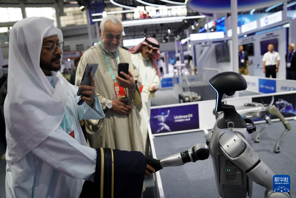 8月28日,嘉賓在第七屆中國—阿拉伯國家博覽會與一款人形機器人握手互動。新華社記者 趙宇思 攝