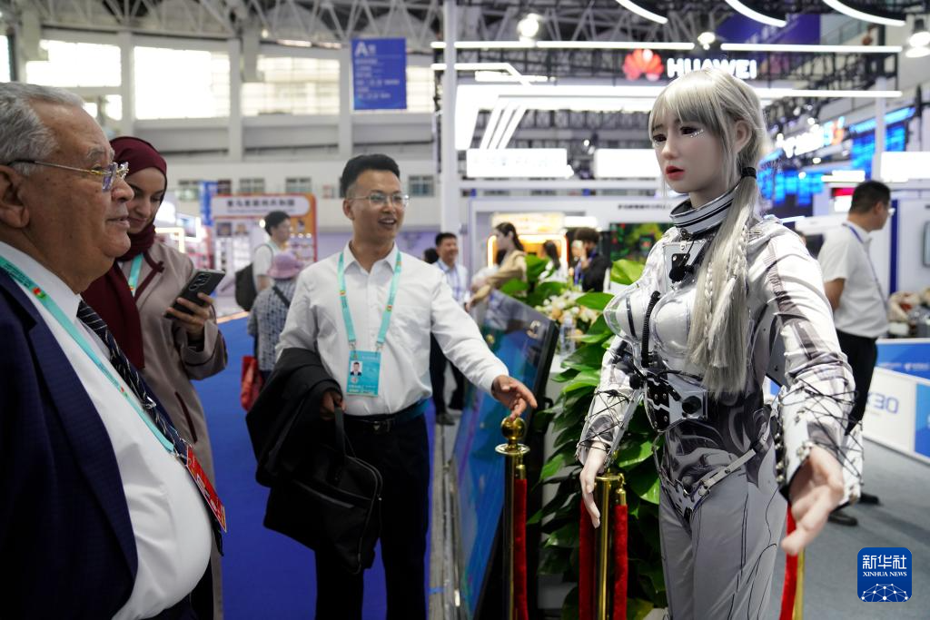 8月28日,嘉賓在第七屆中國—阿拉伯國家博覽會與一款機器人對話互動。新華社記者 趙宇思 攝