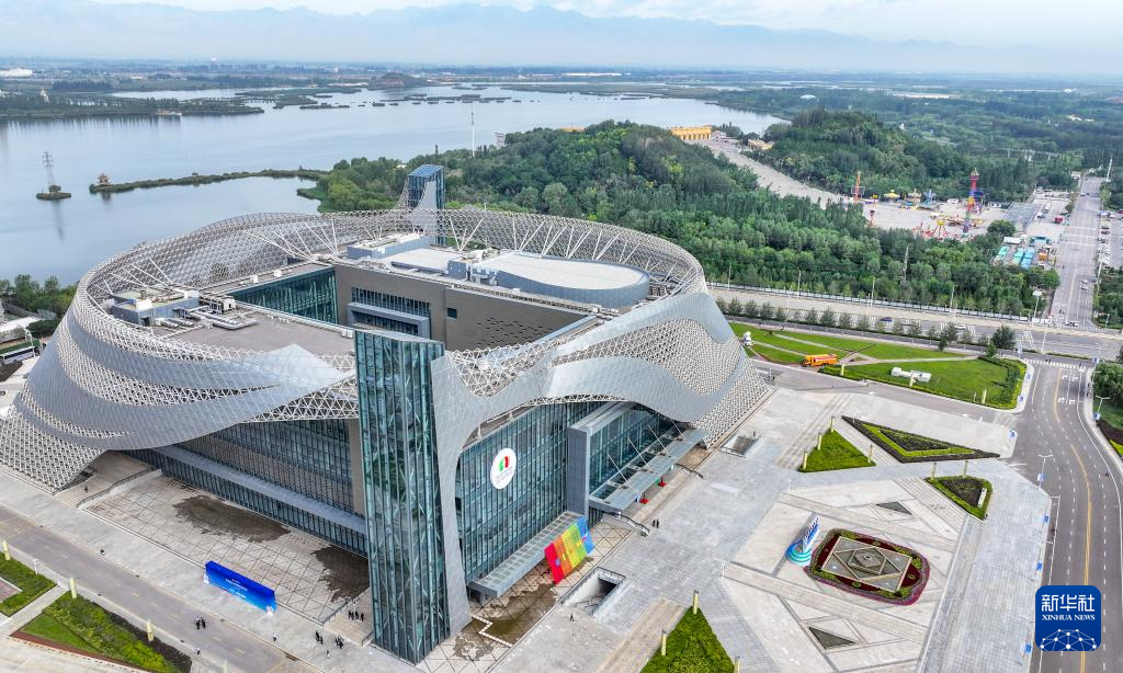 這是8月28日在寧夏銀川市拍攝的第七屆中國—阿拉伯國家博覽會開幕式舉辦地——寧夏國際會堂外景(無人機照片)。新華社記者 馮開華 攝