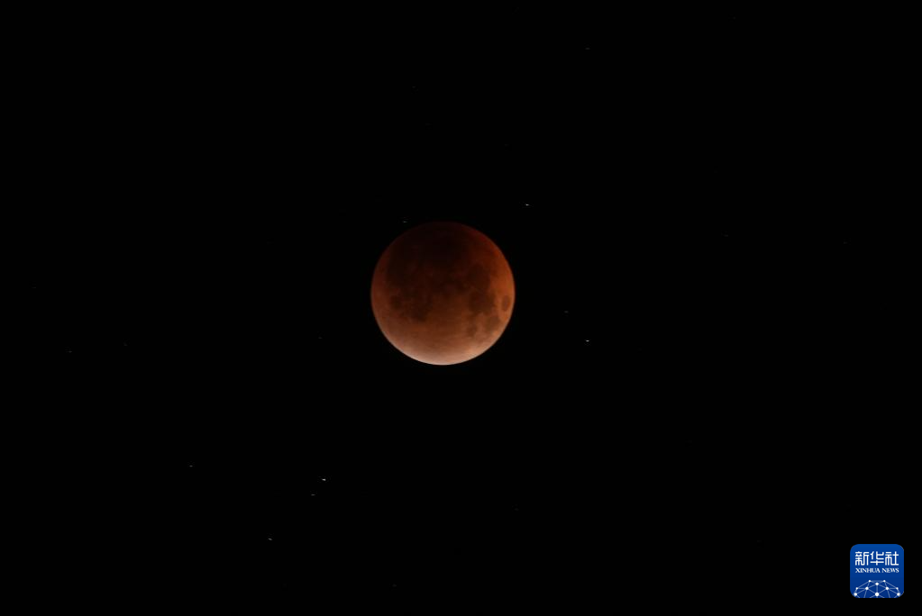 北京時間9月7日午夜至8日凌晨,全球多地天宇上演壯觀的月全食現象。月全食的原理是月、地、日運行至一條直線時,月球進入地球的本影,太陽投射在月球上的光完全被地球擋住。由於地球大氣層對太陽光有折射和散射作用,其中波長最長的紅光落在月面上最多,因而出現“紅月亮”。新華社記者 王鵬 攝