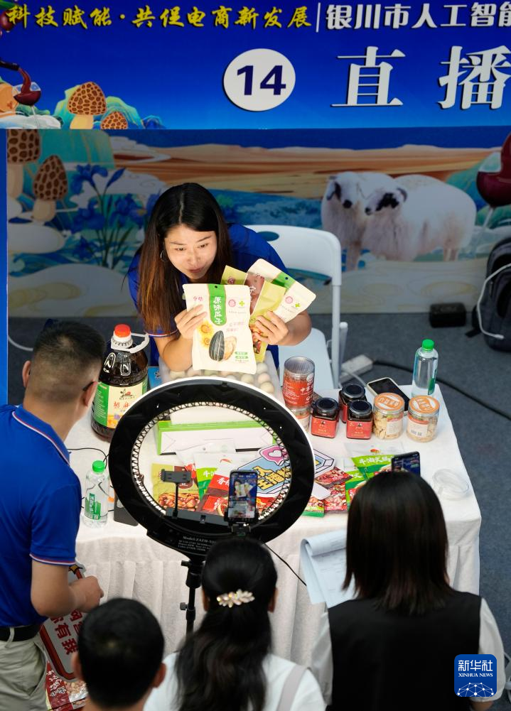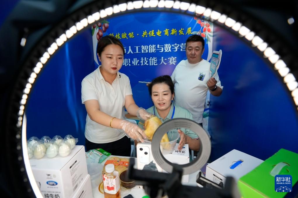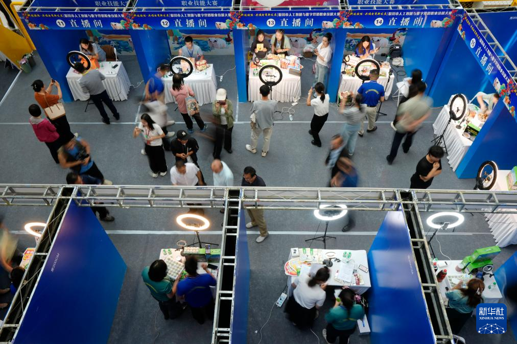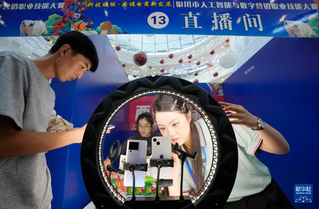 9月12日,寧夏銀川市人工智能與數字營銷職業技能大賽在銀川市金鳳區舉行。60名通過初賽的選手同場競技,現場打造“綠色農産品直播間”“數字人直播間”“退役軍人直播間”“觀眾體驗直播間”等互動區域。通過這次大賽,銀川市將進一步整合行業資源,促進直播電商與本地産業深度融合,激發電商直播領域的創新活力。新華社記者 王鵬 攝