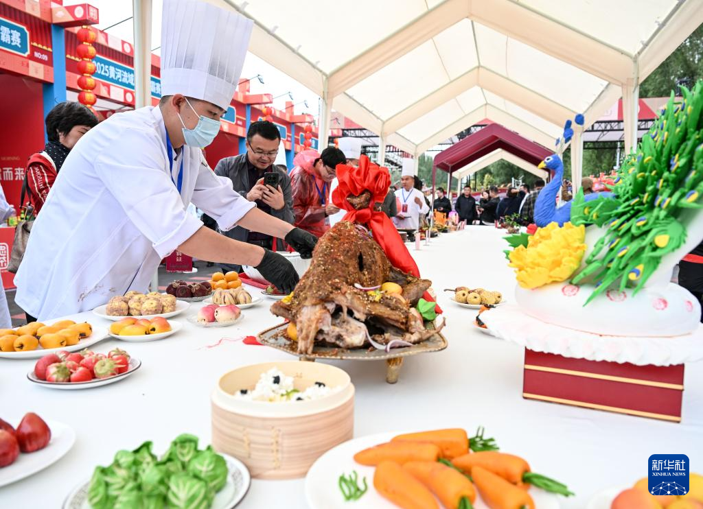 10月1日,在寧夏吳忠市利通區牛家坊民俗文化村舉行的第五屆吳忠早茶美食文化節廚藝爭霸賽上,廚師為游客展示、介紹特色美食。新華社記者 馮開華 攝