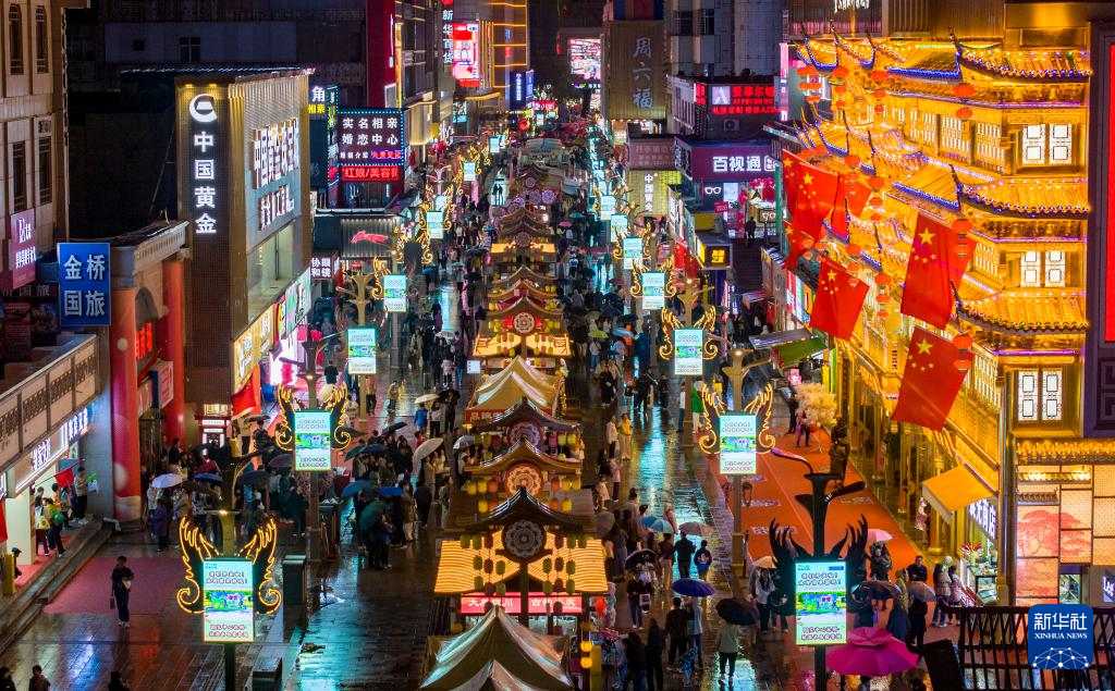 10月5日,游客在寧夏銀川市鼓樓步行街游玩(無人機照片)。