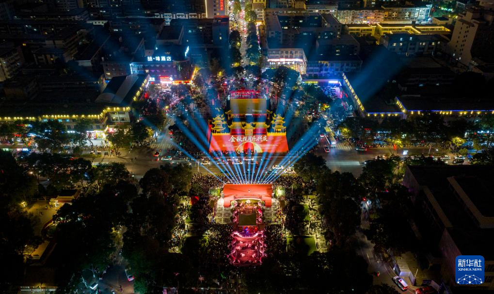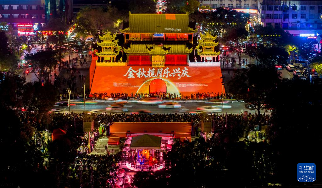 10月6日,游客在寧夏銀川市玉皇閣廣場觀賞文藝演出(無人機照片)。