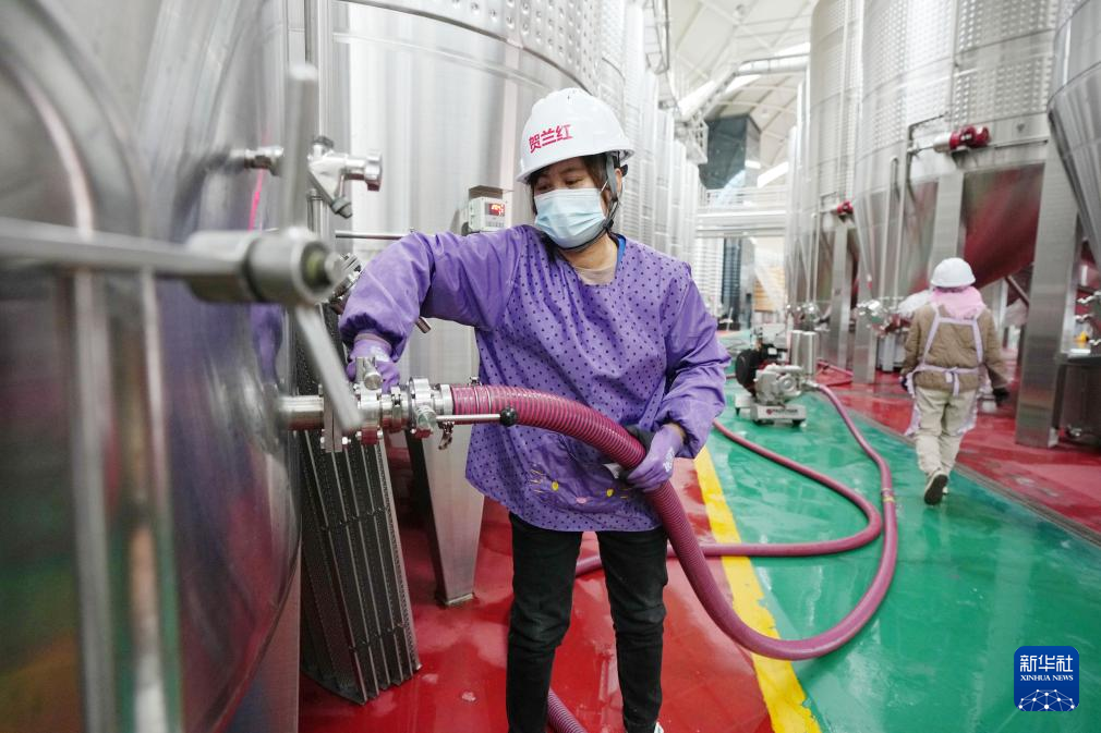 工作人員在銀川市永寧縣閩寧鎮的賀蘭紅酒莊輸送葡萄汁(10月14日攝)。新華社記者 楊植森 攝