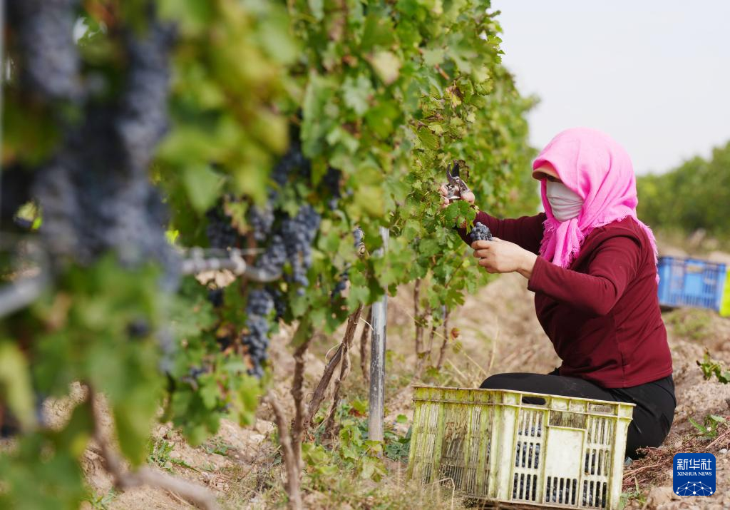 農戶在銀川市永寧縣閩寧鎮葡萄地裏採摘釀酒葡萄(10月14日攝)。新華社記者 楊植森 攝
