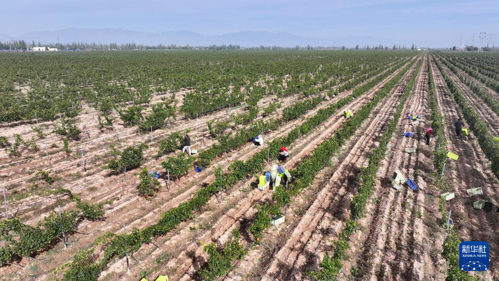 農戶在銀川市永寧縣閩寧鎮葡萄地裏採摘釀酒葡萄(無人機照片,10月14日攝)。新華社記者 楊植森 攝