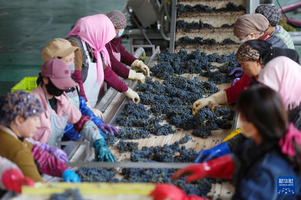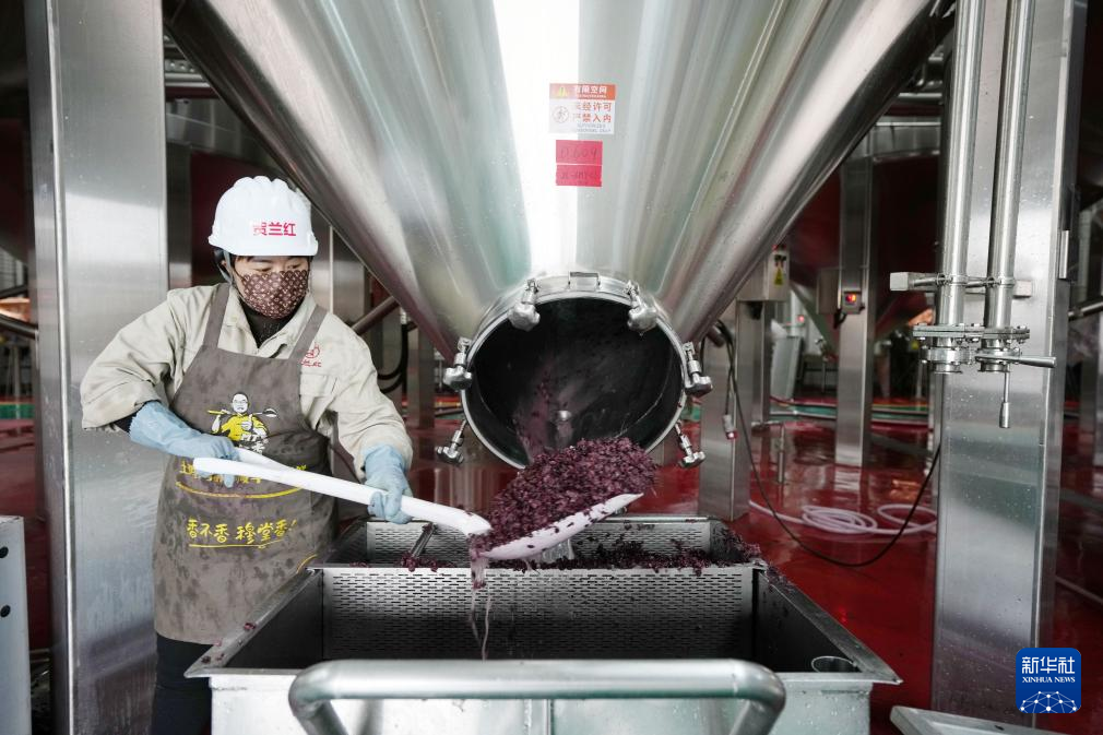 工作人員在銀川市永寧縣閩寧鎮的賀蘭紅酒莊對釀酒葡萄進行壓榨處理(10月14日攝)。新華社記者 楊植森 攝