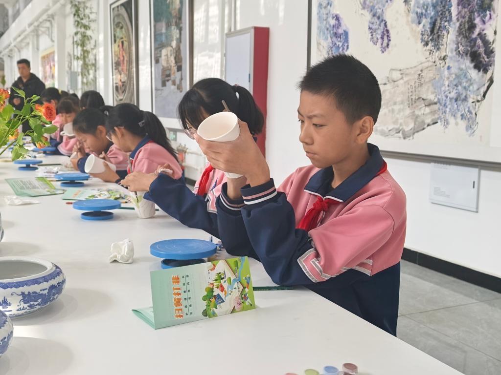 石嘴山市大武口區洗煤廠工業遺址公園的賀蘭山陶瓷藝術館內,幾十名小學生正全神貫注地製作帶有“綠書簽”“護苗”等字樣的陶瓷文創。“通過讓孩子們在陶瓷彩繪的創作體驗中了解‘綠書簽’‘護苗’,既有助於孩子們的身心健康,也能夠提升他們對非遺文化的熱愛。”賀蘭山陶瓷藝術館館長陳剛剛説。