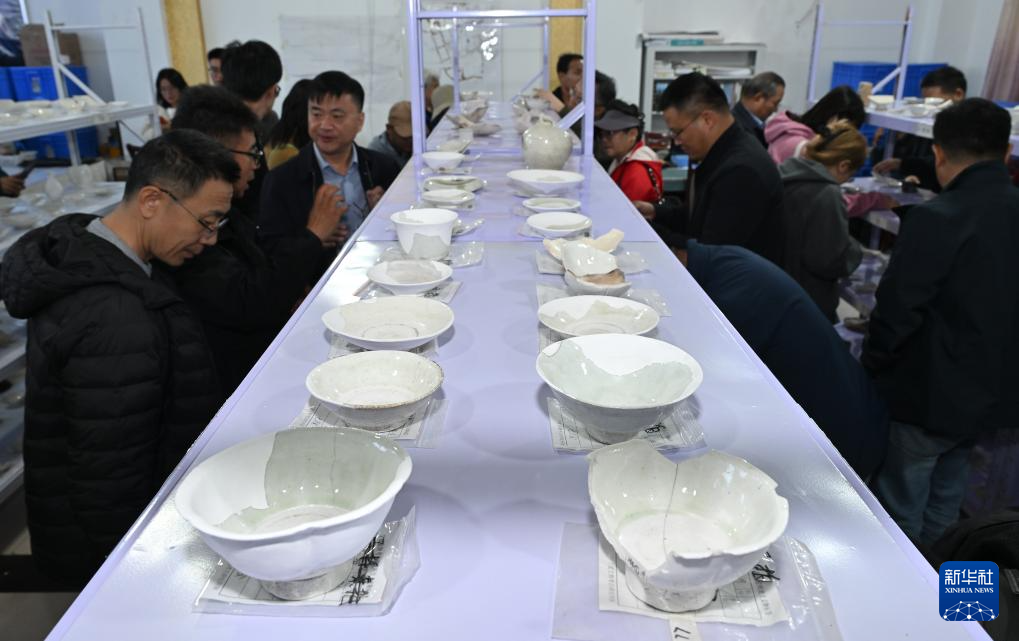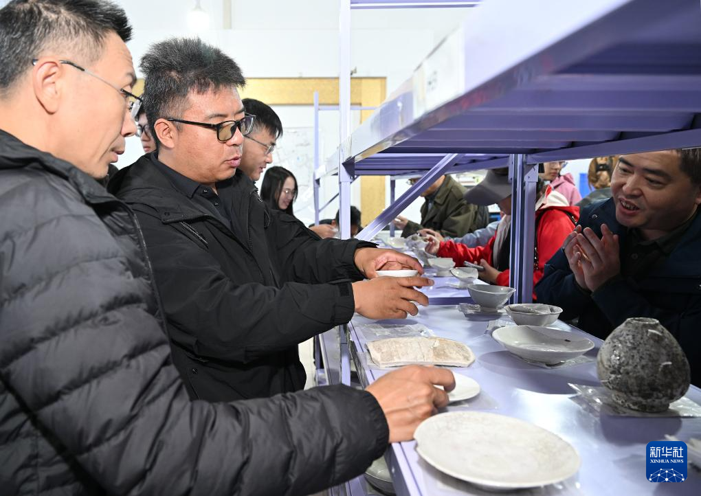 考古學家們在蘇峪口瓷窯址考古隊文物庫房內對出土瓷器進行考察(10月13日攝)。