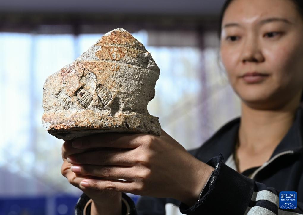 一位工作人員在蘇峪口瓷窯址考古隊文物庫房內展示遺址出土的帶有“官”字款的匣缽殘片(10月13日攝)。
