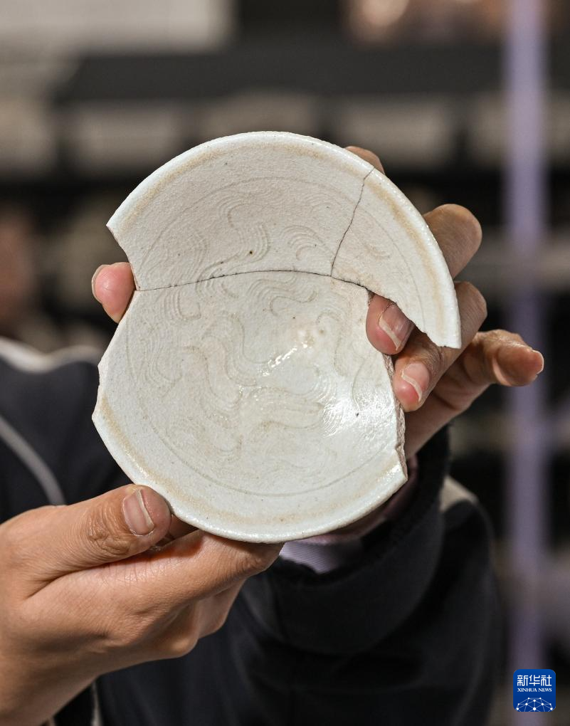 工作人員在蘇峪口瓷窯址考古隊文物庫房內展示發掘出土的帶有刻劃花紋的瓷器殘片(10月13日攝)。