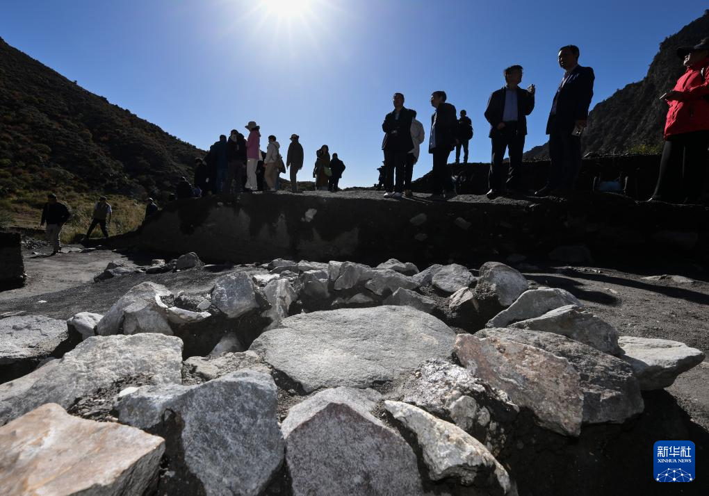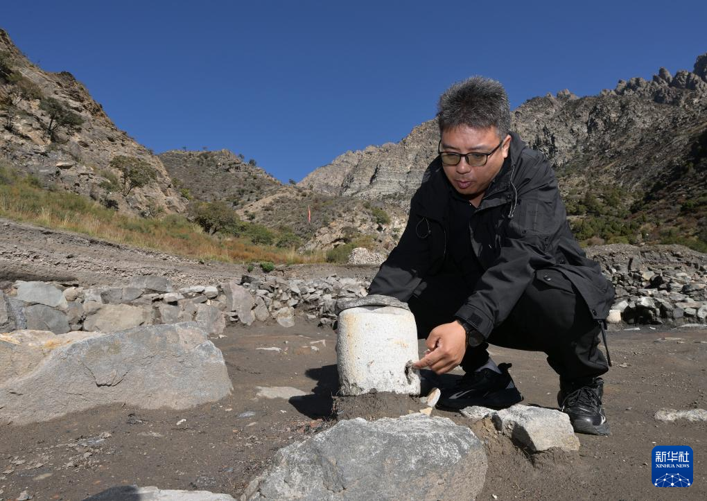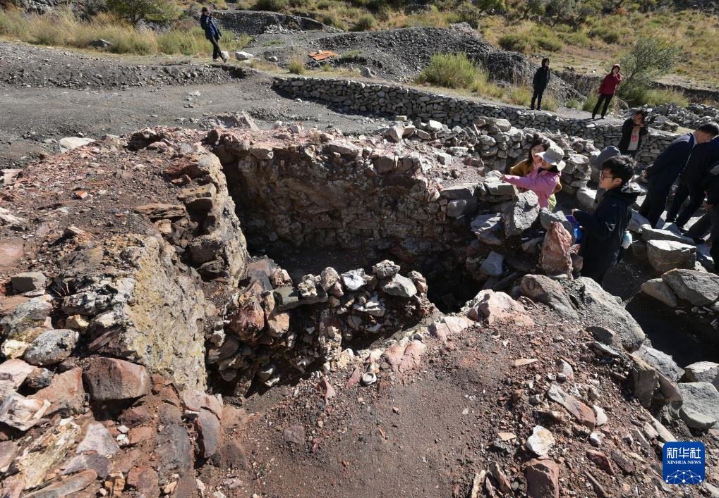 考古學家們在對蘇峪口瓷窯址2025年度發掘區出土的一處石英加工遺跡進行考察(10月13日攝)。
