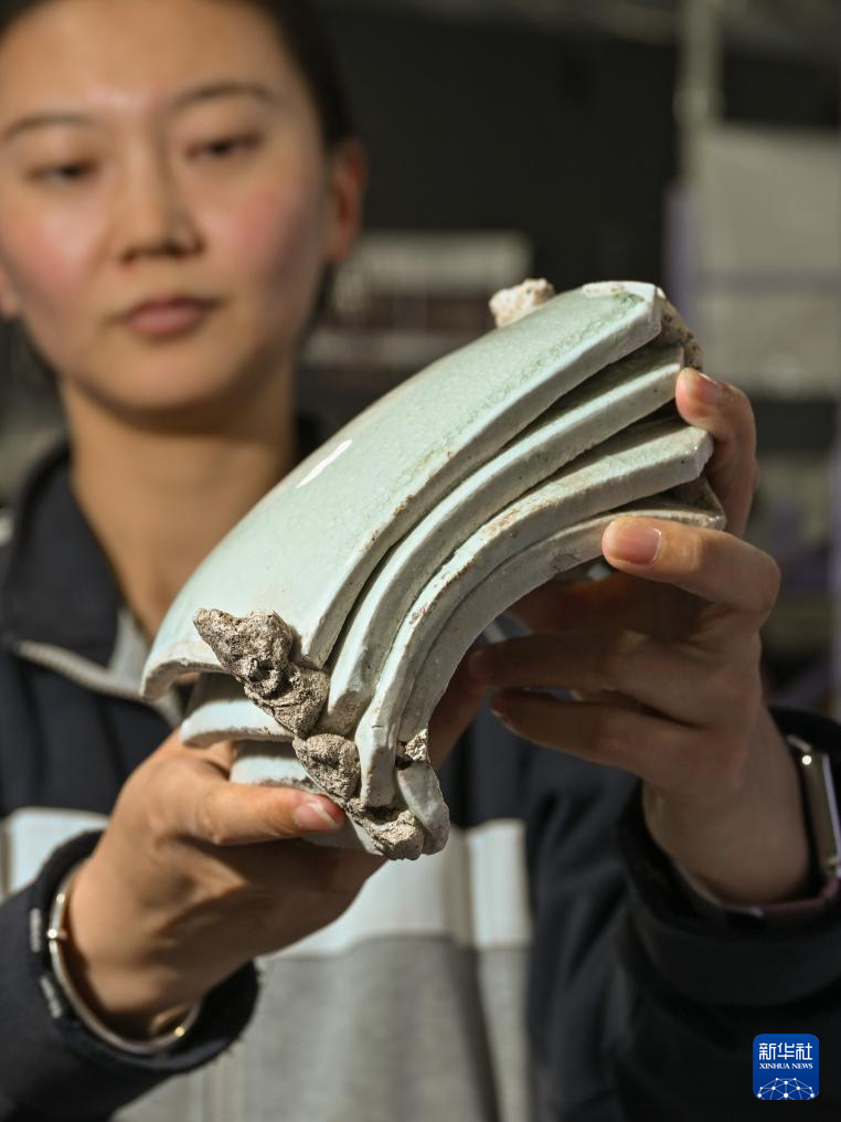 一位工作人員在蘇峪口瓷窯址考古隊文物庫房內展示發掘出土的白瓷板瓦標本(10月13日攝)。