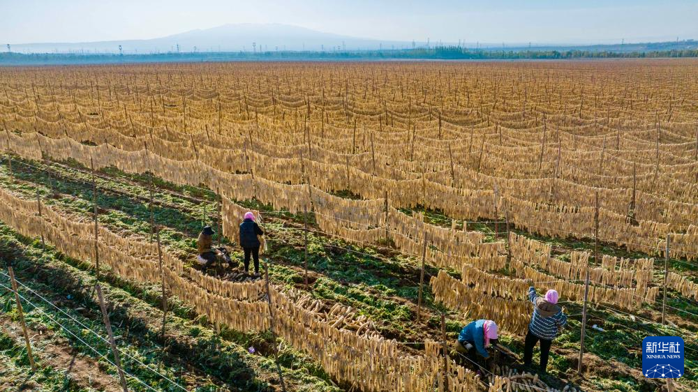 10月29日,農民在寧夏吳忠市紅寺堡區紅寺堡鎮弘德村晾曬蘿蔔條(無人機照片)。