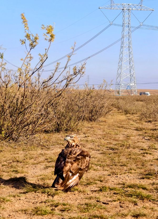 “這鳥看著像大鵟,是國家保護動物!”巡檢人員立刻回憶起國網寧夏超高壓公司此前組織的野生動物保護宣傳培訓內容,曾詳細講解過鷹類的外形特徵、生活習性及保護級別,其標誌性的灰褐色羽毛、銳利的喙部與爪子,與眼前的動物高度吻合。意識到這是國家二級保護動物且處於受傷狀態,巡檢人員不敢怠慢。經仔細觀察發現大鵟翅膀有傷,羽毛略顯凌亂,推測可能是意外撞擊或捕食時不慎受傷,導致無法飛行。