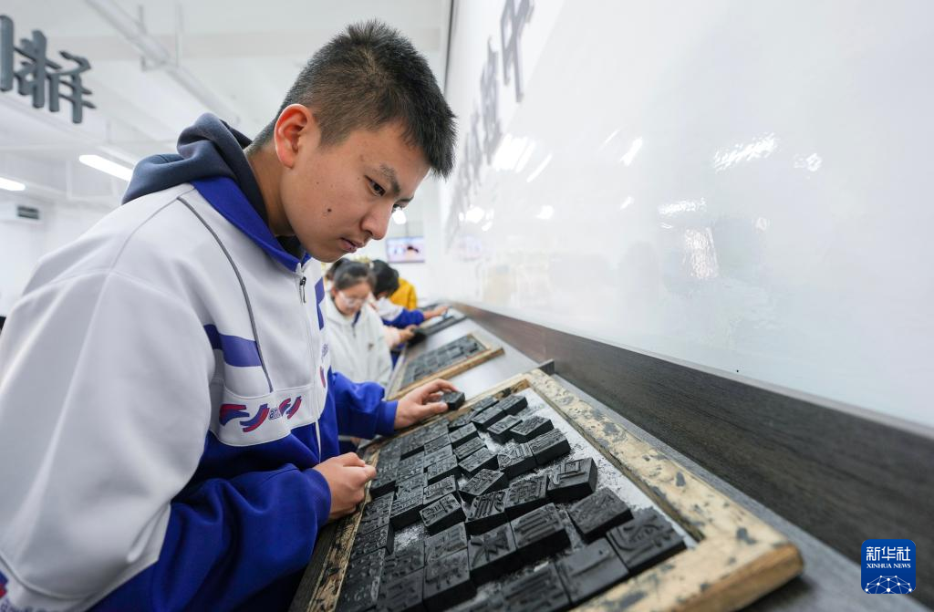 11月14日,寧夏銀川市第二十四中學高一學生在西夏陵國家考古遺址公園內體驗木活字印刷。