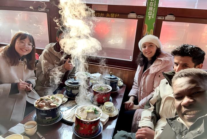 摩洛哥姑娘寶雲(右三)和朋友在寧夏沙湖景區遊船上品嘗特色暖鍋。新華社記者 馮開華 攝