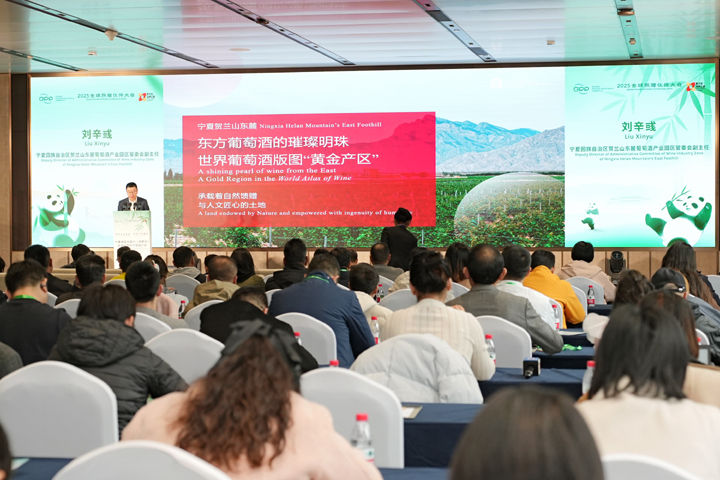 11月21日,在四川成都舉辦的“2025全球熊貓夥伴大會·寧夏特色農産品推介活動”上,寧夏賀蘭山東麓葡萄酒産業園區管委會副主任劉辛彧向與會嘉賓作推介。他&&,賀蘭山東麓葡萄酒産區正以“山河共釀、匠心獨運”的東方風骨躋身世界葡萄酒版圖,成為一張彰顯中國品質、傳遞文化自信的“紫色名片”。