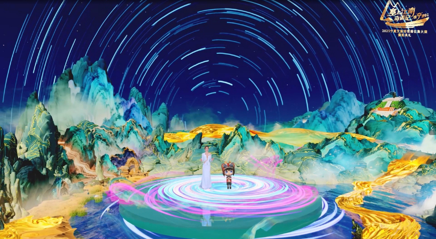 “塞上江南奇遇記·請‘寧’開拍”短視頻徵集大賽頒獎典禮通過實時渲染與虛擬繪景,人物與數字場景完美融合,虛擬動畫形象與主持人同&互動,構建出一個虛實交織、自由轉換的“無界舞&”,傳統與現代混搭的節目編排和科技加藝術的創意呈現,讓寧夏之“美”驚艷綻放。