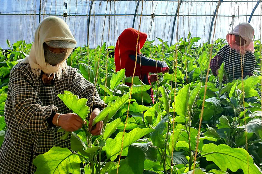走進蘆溝閘村設施産業園內,一串串色澤紫亮、飽滿圓潤的茄子垂挂枝頭。種植戶王建忠小心翼翼地將成熟茄子從藤蔓上剪下,語氣裏掩不住喜悅之情,“我種了46個棚,每個棚的茄子産量4萬斤,按照現在每斤2.8元的市場價估算,能收入90多萬元。”