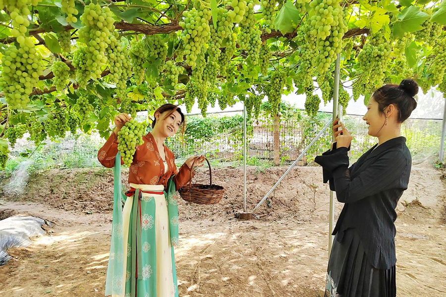 與葡萄産業相得益彰的是全鄉設施農業的快速發展。全鄉3675畝設施瓜菜四季供應不斷,其中日光溫室瓜菜面積為1500畝、聯棟大棚及拱棚瓜菜面積為398畝。新接堡村建設了65座溫室大棚用於發展設施蔬菜種植,並依託“村社共富直通車”等銷售渠道,實現了農産品從大棚直接供應到社區、食堂、企業的高效模式。