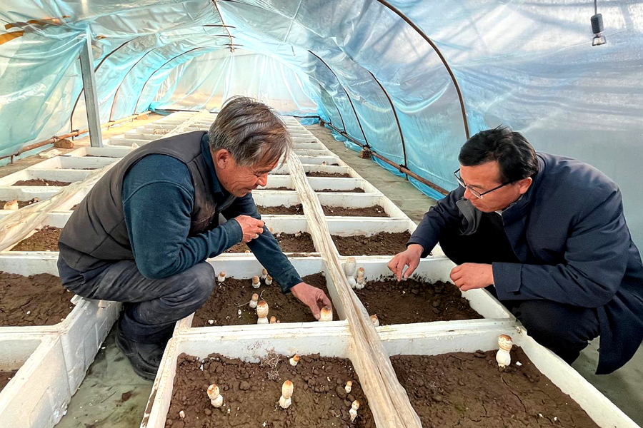 在楊甘寧的菌棚裏,擁有30年種植經驗的“土專家”張銀平正俯身查看菇體長勢,細緻叮囑管護要點:“要注意棚膜不能滴水,菇頂沾水就會影響品相,日常要注意控溫通風……”