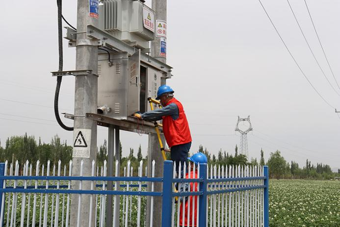 在楊郎村果蔬分揀車間,工人們將蔬菜除去多餘枝葉、裝箱、加冰塊、密封、統一封存入庫,等待冷鏈車運輸。國網固原供電公司共産黨員服務隊隊員李儉波、胡漢平正在冷庫外用萬用錶測量內線電流情況。