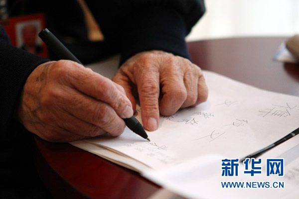 3月6日,新華網記者專訪全國政協委員、著名書法家歐陽中石先生。圖為歐陽中石先生動筆書寫,圖解文字的象形含義。新華網記者 楊理光攝