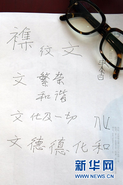 3月6日,新華網記者專訪全國政協委員、著名書法家歐陽中石先生。一張紙上,歐陽中石先生寫出了“文、德、化、和”,並&&這四個字是中華文化的精髓。新華網記者 楊理光攝
