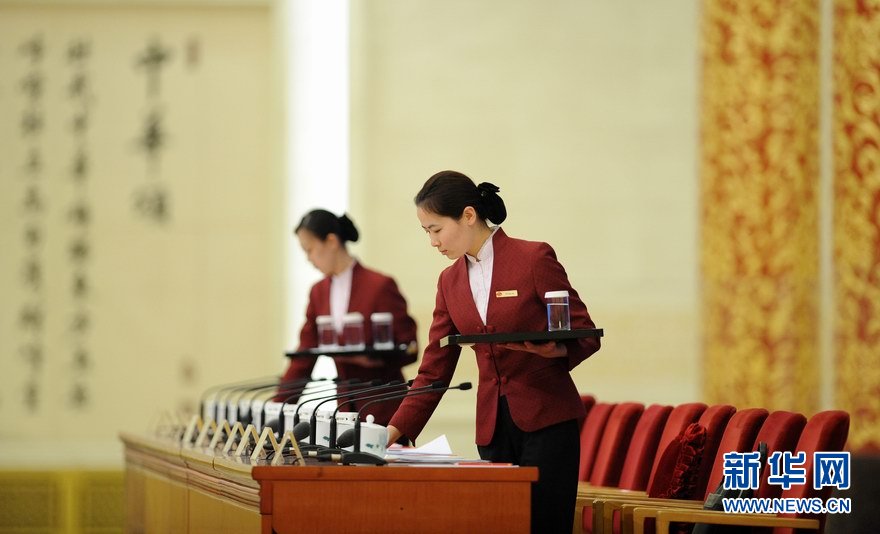 十二屆全國人大一次會議、全國政協十二屆一次會議分別於2013年3月5日、3月3日在北京人民大會堂開幕。在會議進行期間,有一批女性身影,她們,因為出席兩會、因為服務兩會、因為報道兩會而工作着、美麗着。在三八國際婦女節來臨之際,讓我們為她們喝彩!圖為3月6日,2名大會堂服務人員正在佈置金色大廳記者會現場。新華網 陳競超 攝