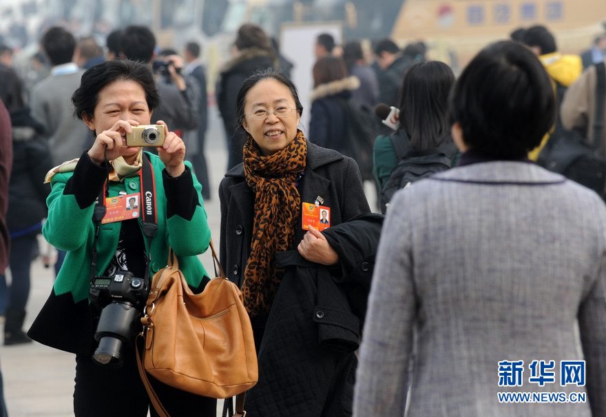 十二屆全國人大一次會議、全國政協十二屆一次會議分別於2013年3月5日、3月3日在北京人民大會堂開幕。在會議進行期間,有一批女性身影,她們,因為出席兩會、因為服務兩會、因為報道兩會而工作着、美麗着。在三八國際婦女節來臨之際,讓我們為她們喝彩!圖為3月5日,幾名女政協委員在大會堂東門外廣場拍照留影。新華網 陳競超 攝