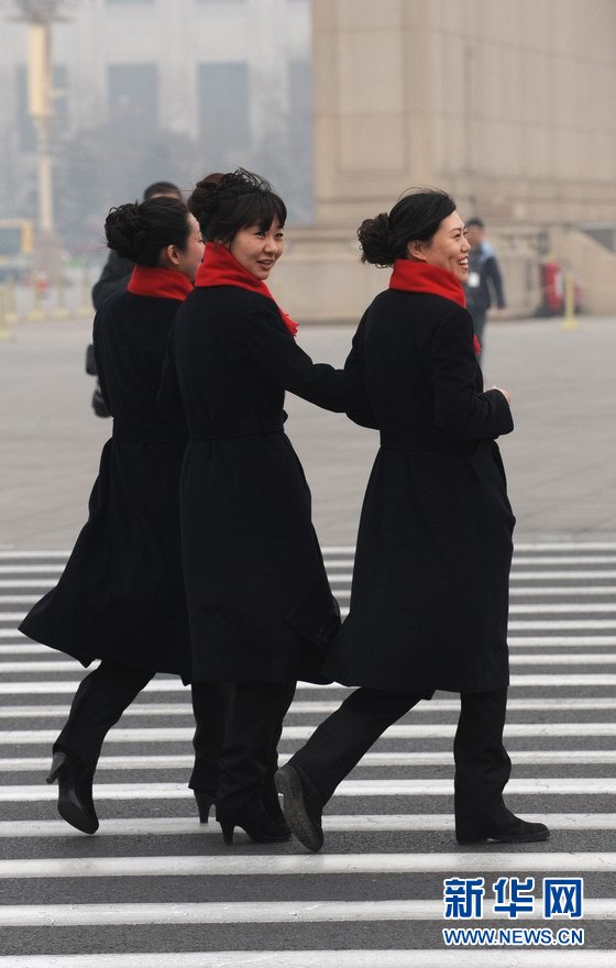 十二屆全國人大一次會議、全國政協十二屆一次會議分別於2013年3月5日、3月3日在北京人民大會堂開幕。在會議進行期間,有一批女性身影,她們,因為出席兩會、因為服務兩會、因為報道兩會而工作着、美麗着。在三八國際婦女節來臨之際,讓我們為她們喝彩!圖為3月7日,幾名大會禮賓服務人員走過大會堂東門外廣場。新華網 陳競超 攝