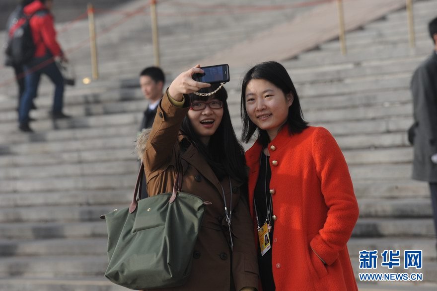 十二屆全國人大一次會議、全國政協十二屆一次會議分別於2013年3月5日、3月3日在北京人民大會堂開幕。在會議進行期間,有一批女性身影,她們,因為出席兩會、因為服務兩會、因為報道兩會而工作着、美麗着。在三八國際婦女節來臨之際,讓我們為她們喝彩!圖為3月8日,2名女記者在大會堂外合影。新華網 陳競超 攝