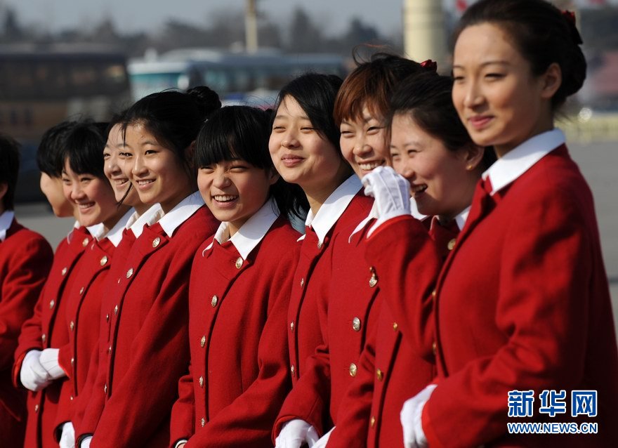 十二屆全國人大一次會議、全國政協十二屆一次會議分別於2013年3月5日、3月3日在北京人民大會堂開幕。在會議進行期間,有一批女性身影,她們,因為出席兩會、因為服務兩會、因為報道兩會而工作着、美麗着。在三八國際婦女節來臨之際,讓我們為她們喝彩!圖為3月3日,幾名會議禮賓服務人員在大會堂東門外廣場交談。新華網 陳競超 攝