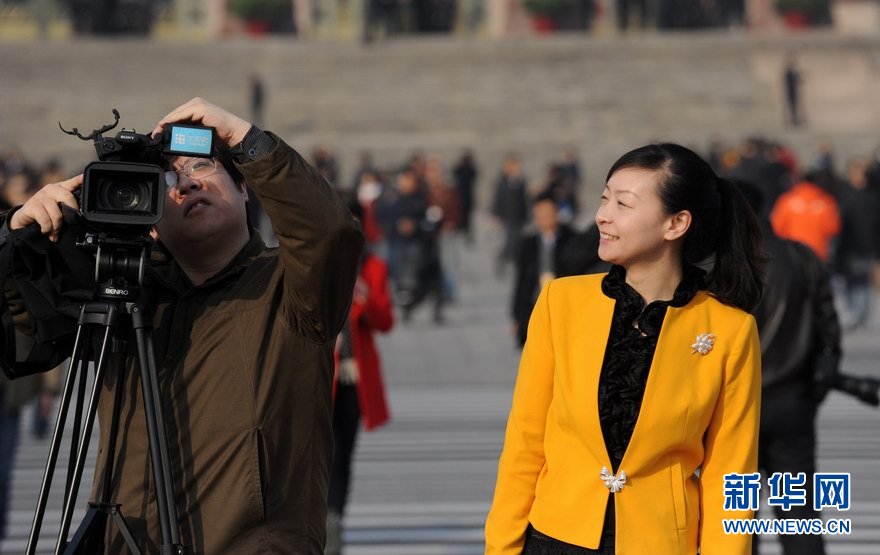 十二屆全國人大一次會議、全國政協十二屆一次會議分別於2013年3月5日、3月3日在北京人民大會堂開幕。在會議進行期間,有一批女性身影,她們,因為出席兩會、因為服務兩會、因為報道兩會而工作着、美麗着。在三八國際婦女節來臨之際,讓我們為她們喝彩!圖為3月5日,一名女記者在大會堂東門外廣場與同事交談。新華網 陳競超 攝