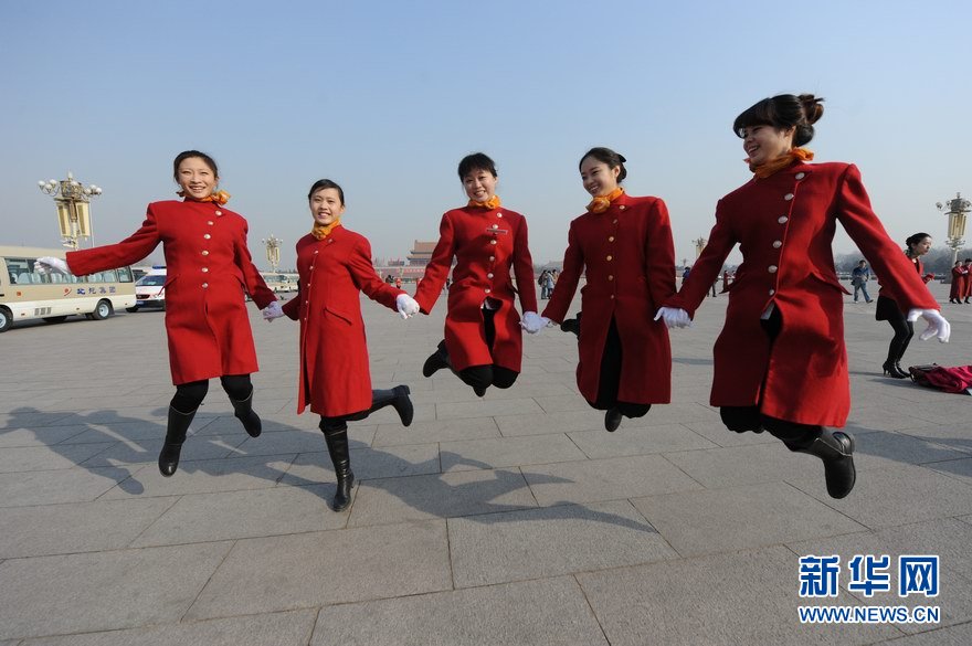 十二屆全國人大一次會議、全國政協十二屆一次會議分別於2013年3月5日、3月3日在北京人民大會堂開幕。在會議進行期間,有一批女性身影,她們,因為出席兩會、因為服務兩會、因為報道兩會而工作着、美麗着。在三八國際婦女節來臨之際,讓我們為她們喝彩!圖為3月5日,幾名大會禮賓服務人員在大會堂東門外廣場盡情綻放青春靚影。新華網 陳競超 攝