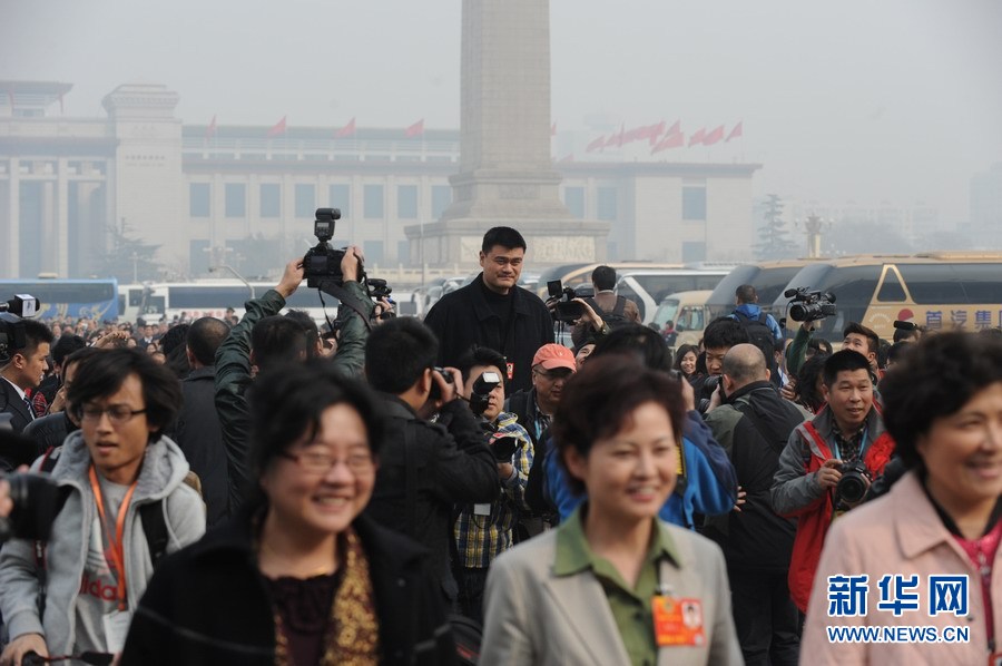 3月11日下午3時,全國政協十二屆一次會議在人民大會堂舉行第四次全體會議,選舉政協第十二屆全國委員會主席、副主席、秘書長、常務委員。出席會議的政協委員中那些“明星臉”永遠是最吸引記者鏡頭的一個群體。圖為姚明在大會堂東門外廣場被記者圍追拍照。新華網 陳競超 攝