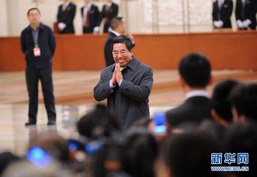 十二屆全國人大一次會議3月14日上午舉行第四次全體會議,選舉第十二屆全國人民代表大會常務委員會委員長、副委員長、秘書長,選舉第十二屆全國人民代表大會常務委員會委員,選舉中華人民共和國主席、副主席,選舉中華人民共和國中央軍事委員會主席;表決關於國務院機構改革和職能轉變方案的決定草案。早上8時左右,記者們早早來到大會堂北大廳,在這裡等候由此進入會場的部長們。圖為統計局局長馬建堂婉拒記者採訪邀請。新華網 陳競超 攝